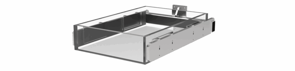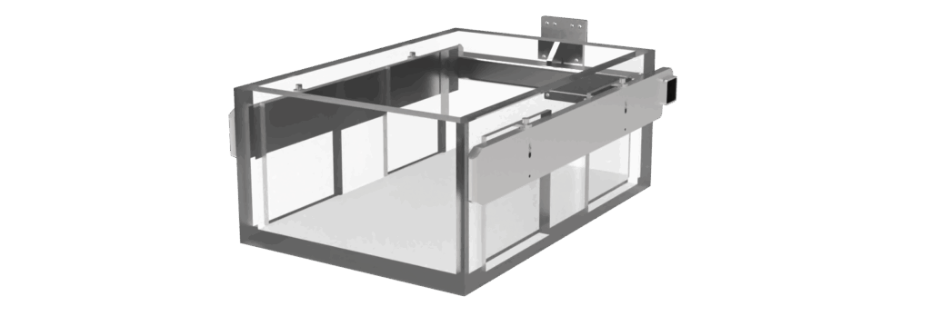 The fork is configurable from 300 to 600 mm in length, and the width of the fork depends on the customer’s bin dimensions.